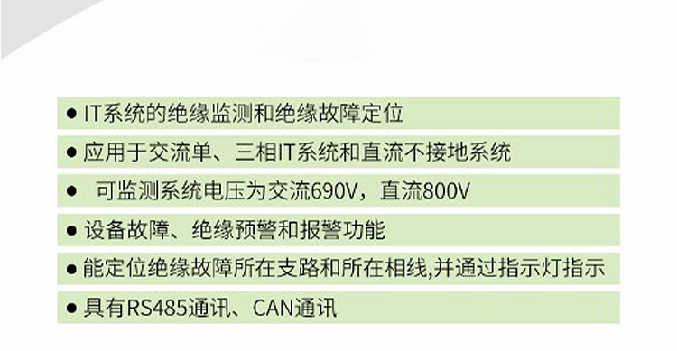 統出現接地故障時(shí),能及時(shí)報警,并準確定位故障發(fā)生的具體回路,以提醒相關(guān)人員及時(shí)排查故障。產(chǎn)品符合企業(yè)標準《IT 系統絕緣監測儀》(Q/VDCL-26-2017)以及相關(guān)國家標準。