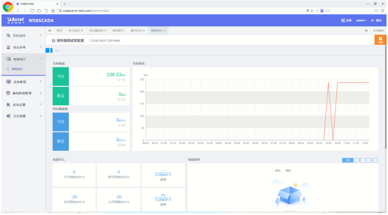 能耗統計頁(yè)面顯示各回路的功率峰值和用電量峰值,功率、電能趨勢曲線(xiàn),電能環(huán)比, 用電排名。