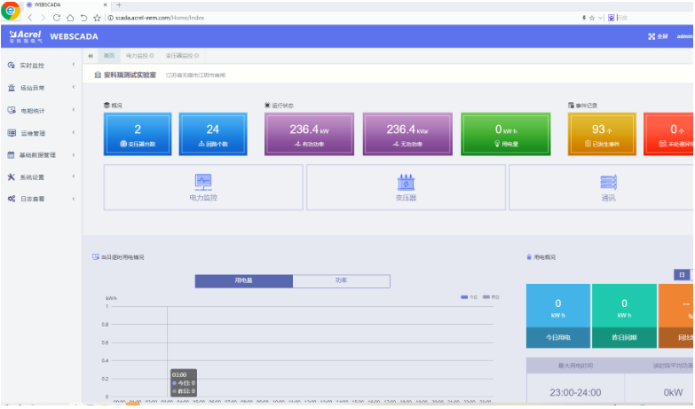 展示頁(yè)面顯示變電站數量、變壓器數量、監測點(diǎn)位數量等概況信息,設備通信狀態(tài),用電分析和事件記錄。首頁(yè)顯示場(chǎng)站的變壓器數量、回路個(gè)數、有功功率、無(wú)功功率、用電量、事件記錄等概況信息,可通過(guò)實(shí)時(shí)監控、變壓器、通信、視頻切換到需要查看的界面。