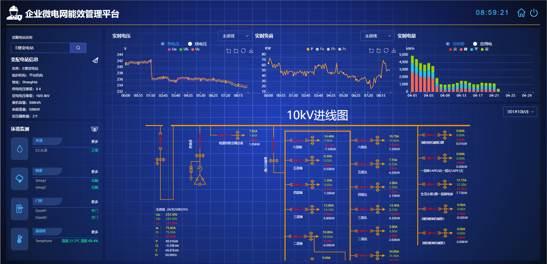 可對配電系統回路的漏電電流和線(xiàn)纜溫度進(jìn)行實(shí)時(shí)監測,實(shí)現安全預警。 另外還可以接入消防設備電源監控系統、防火門(mén)監控系統、應急照明及疏散指示系統的報警信息。平臺可實(shí)時(shí)監測配電系統的諧波畸變、電壓波動(dòng)、閃變和容忍度指標分析配電系統的電能質(zhì)量。